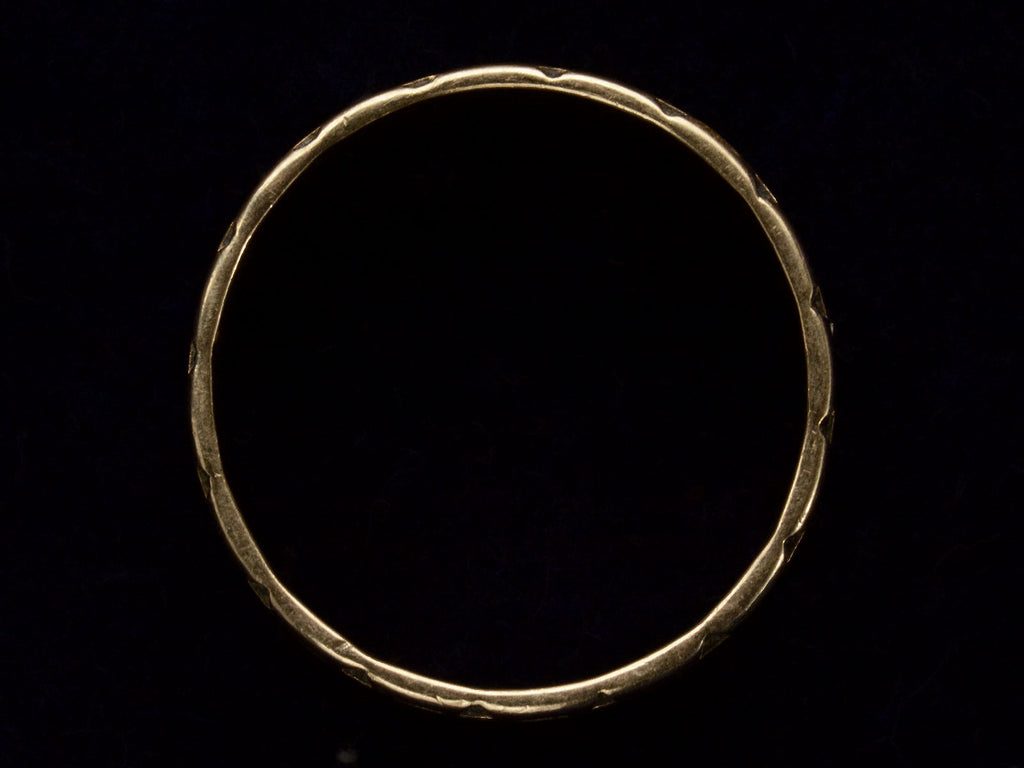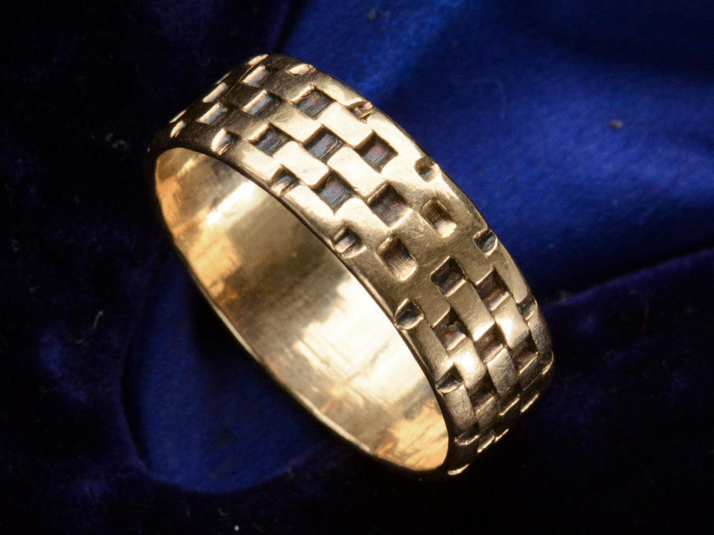Side profile of c1950 Link Pattern Gold Wedding Band (on black background)