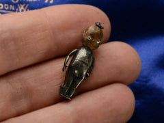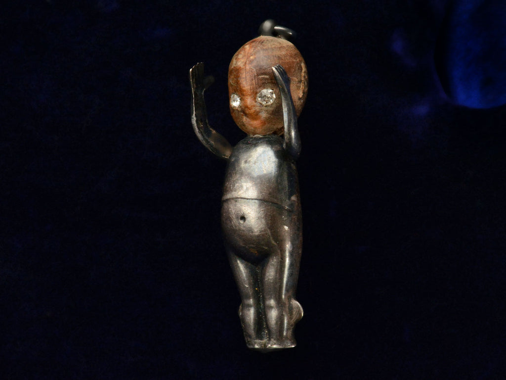 A very rare World War I era "Touch Wood" Kewpie doll charm, with articulated arms, a sterling silver body and a wooden head. It would have been worn by an English soldier during World War I as a talisman; the wooden head touched for luck. An English registry mark is stamped on its back.