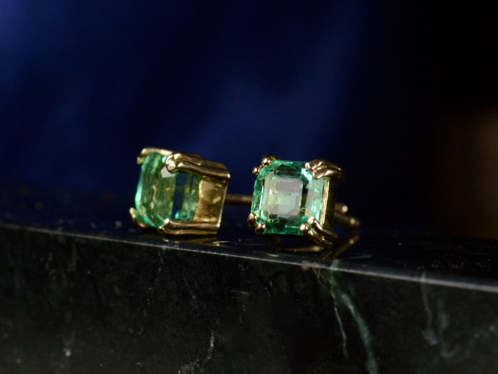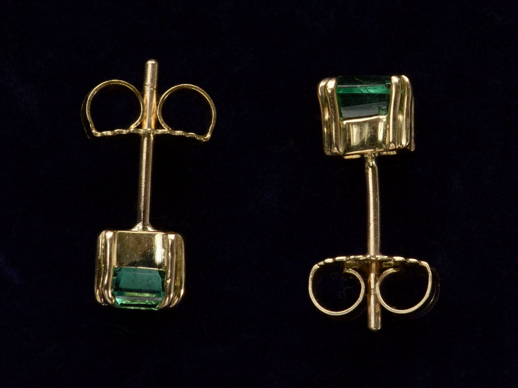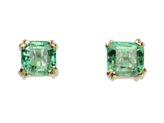 A pair of vintage c1980 stud earrings with beautiful pale cool green Colombian emeralds set in 18K yellow gold. They total 1.43 carats.