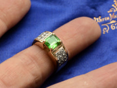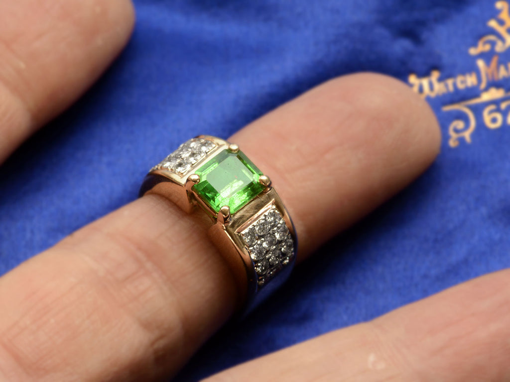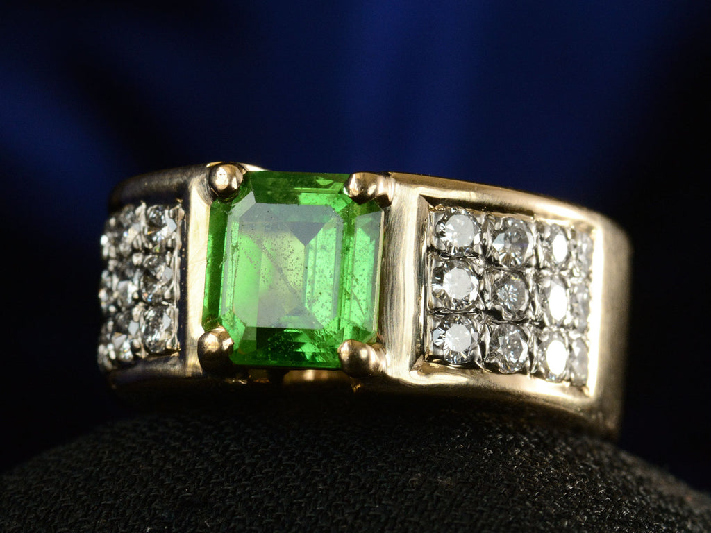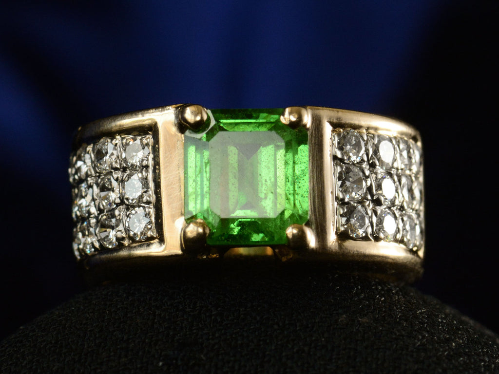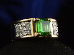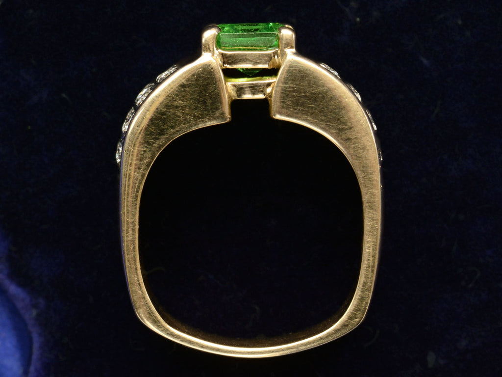 A c1980 vintage ring with a lime green natural tsavorite weighing approximately two carats set in a wide two toned mounting with clusters of white diamonds on either shoulder. Comes with a GIA certificate identifying the tsavorite as natural.